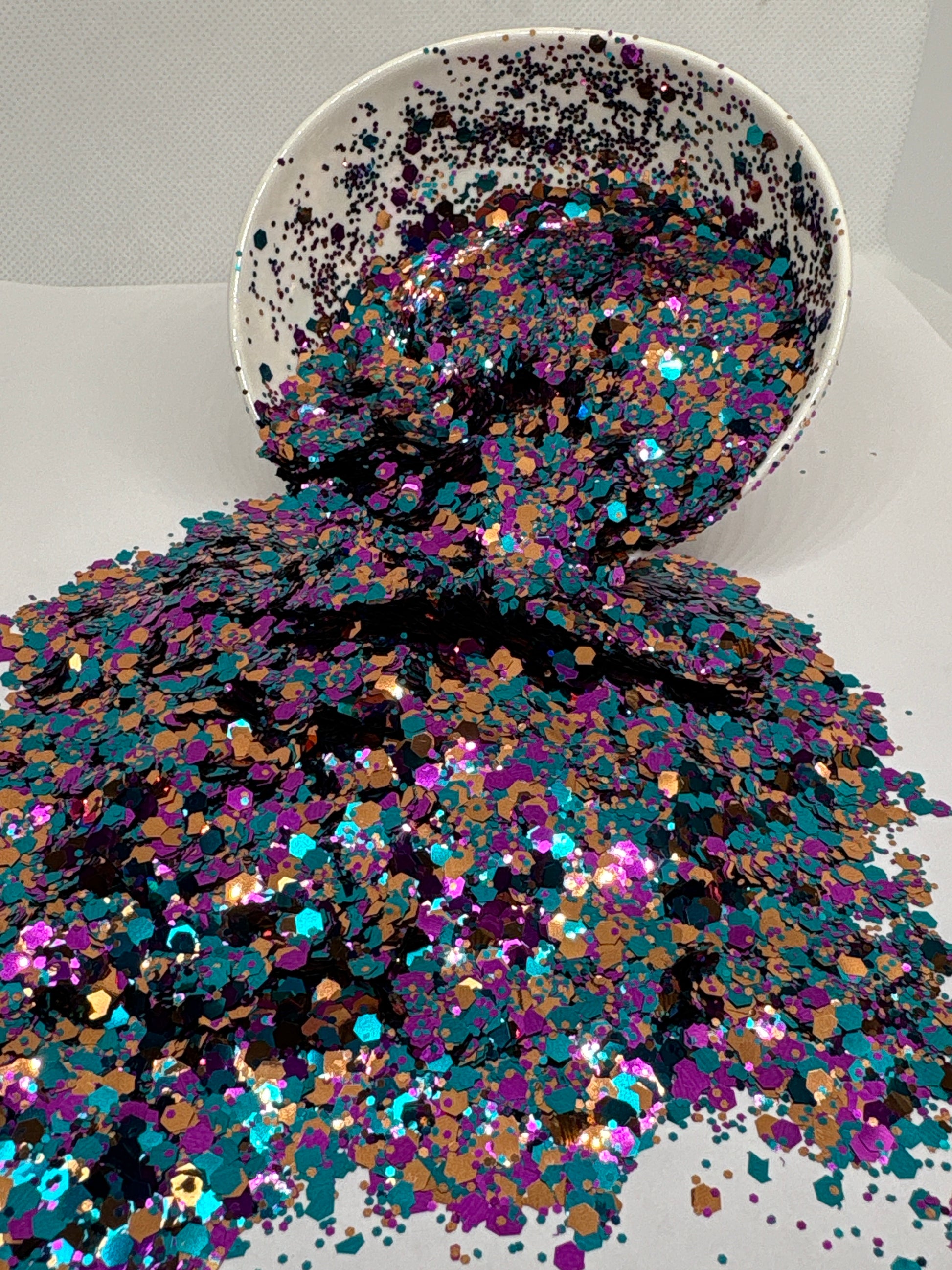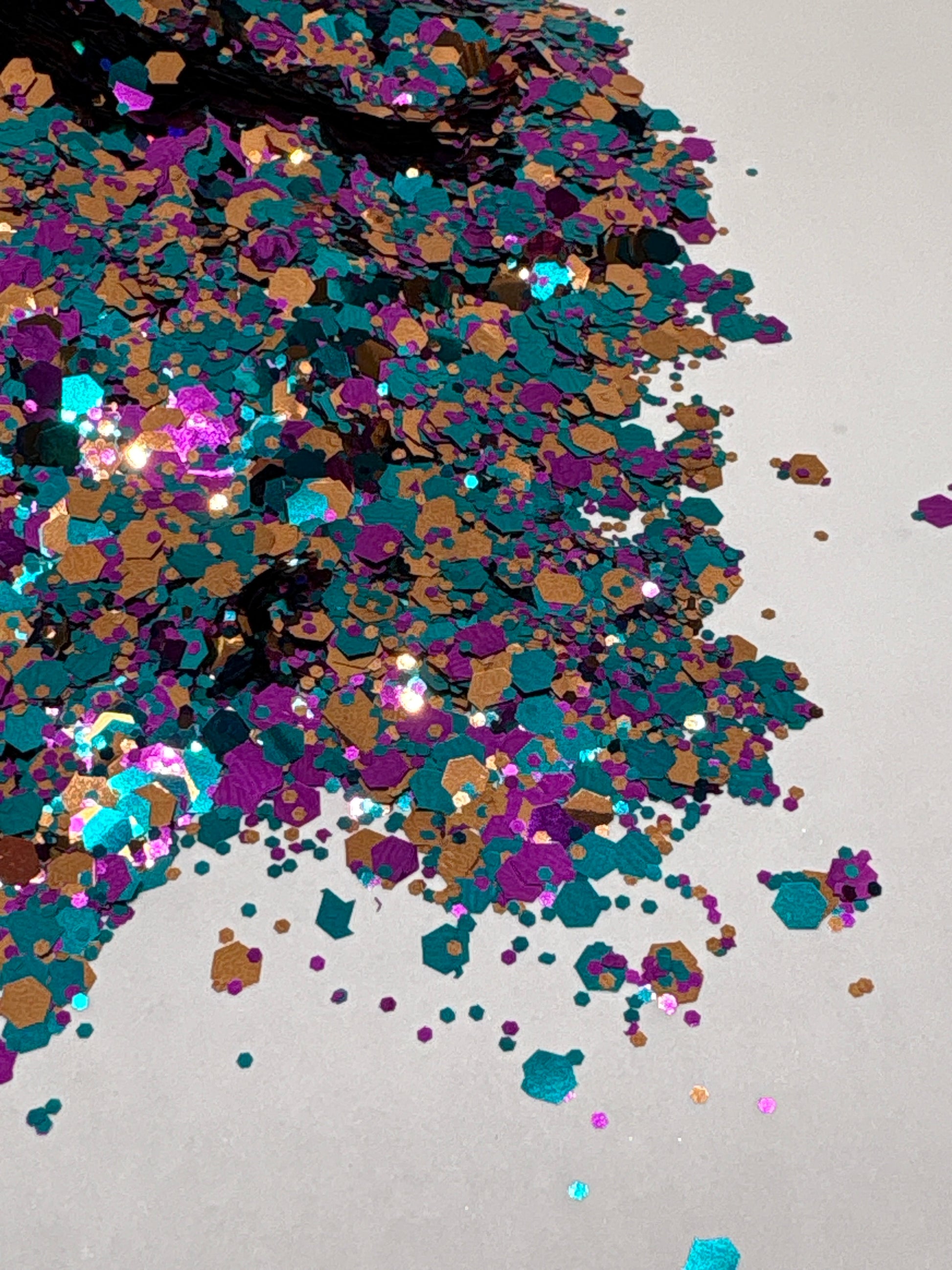 This glitter runs deep and mysterious, just like a canyon carved by time. Rich shades of violet shimmer with hints of copper and teal blue, echoing the rugged beauty of stone walls catching the last light of dusk. Amethyst Canyon brings the drama of wide-open spaces and hidden treasures of the West, making every project feel like a ride through a gemstone-studded gorge. 💜⛰️✨