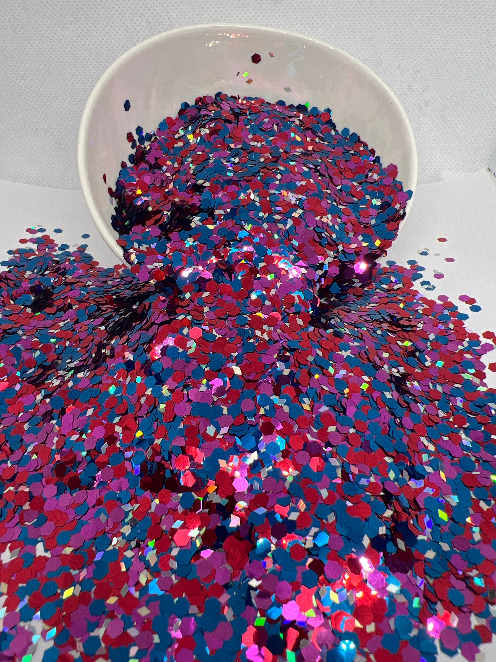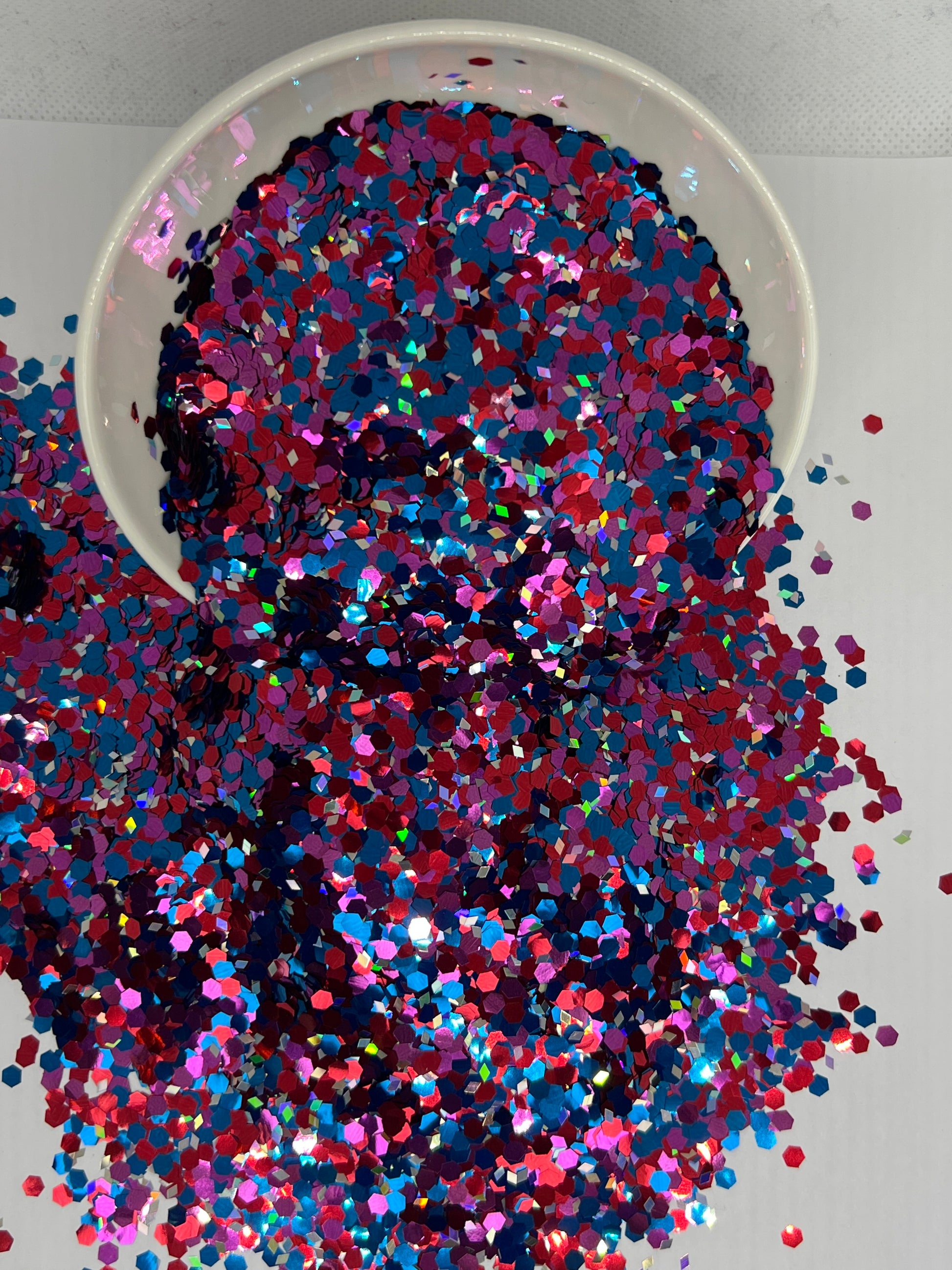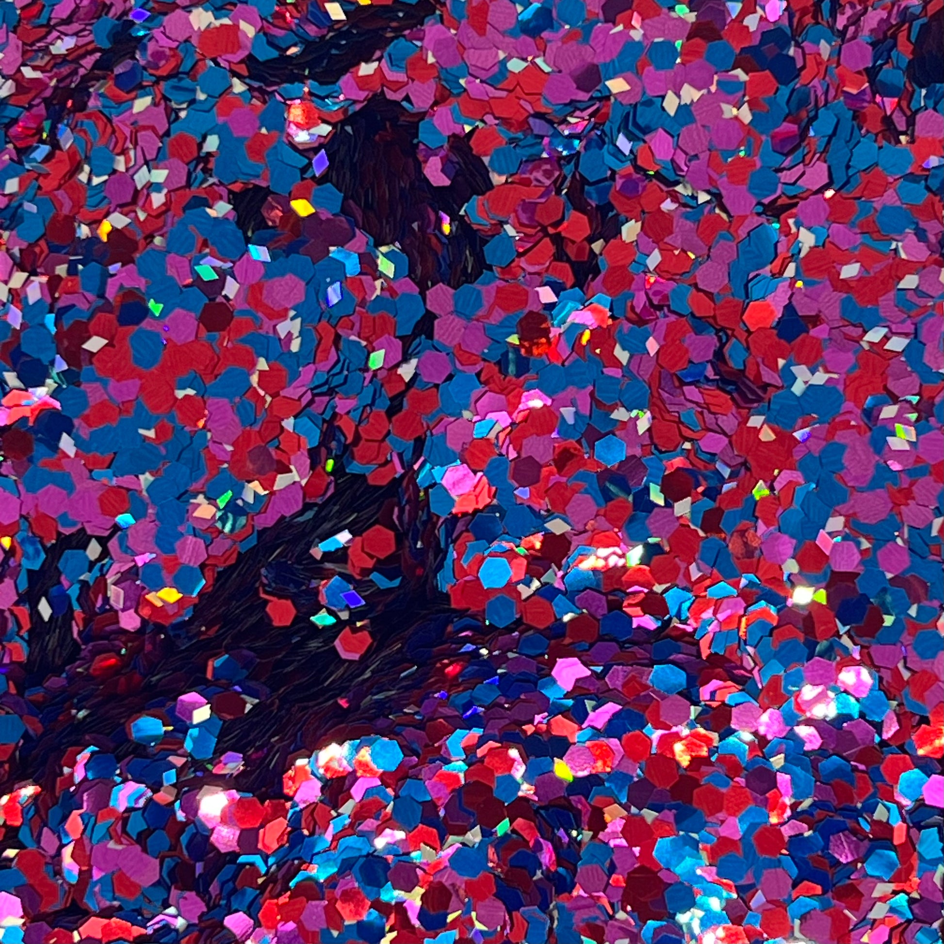 Blazin’ Saddle is a fiery, high-energy custom glitter mix featuring a bold fusion of red, blue-teal, magenta, and silver. This dynamic combination catches the light from every angle, delivering intense sparkle and dimension. Perfect for tumblers, resin art, and statement projects that need a burst of vibrant western flair.