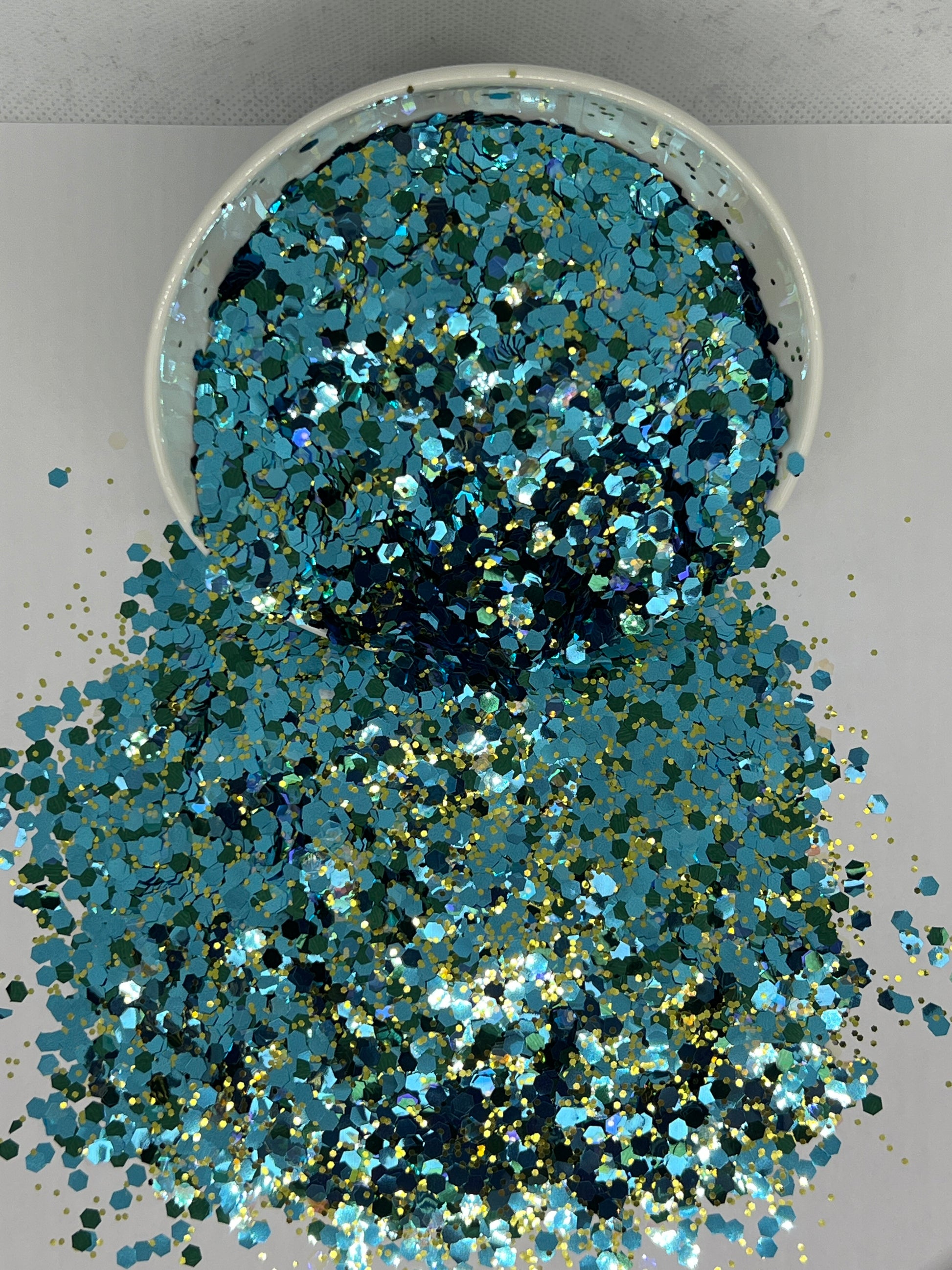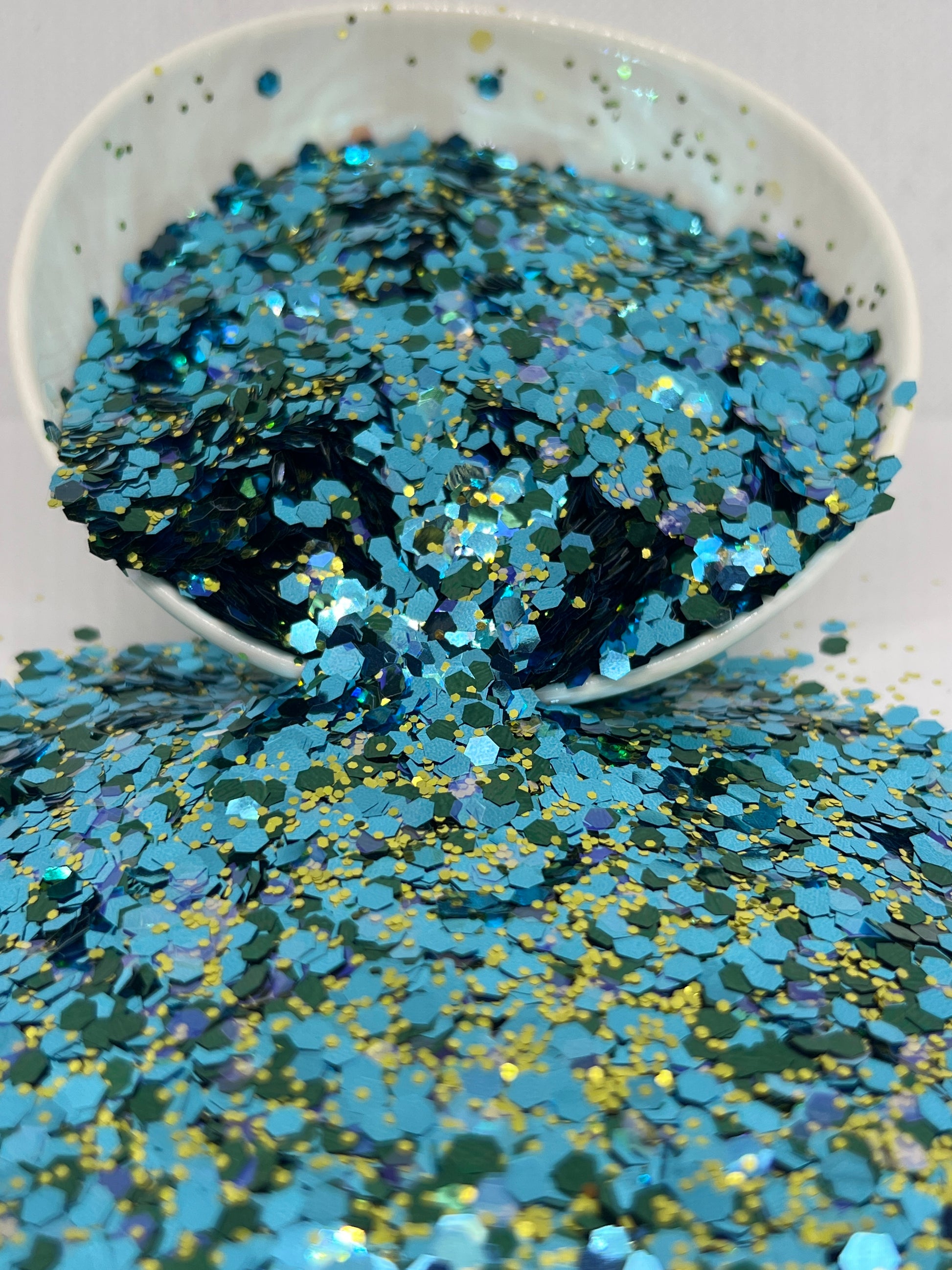 Blue-Eyed Cowboy – A striking mix that tips its hat to bold western charm. Teal blue lays the foundation, while chartreuse yellow-green and deep hunter green add earthy vibrance. Opal iridescence gives it a shimmering, multifaceted glow that shifts beautifully in the light—perfect for projects that ride the line between rustic and refined.