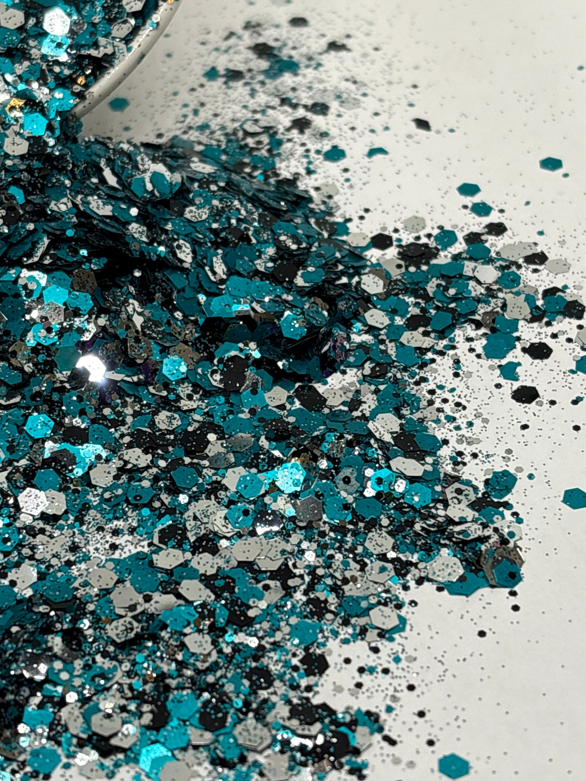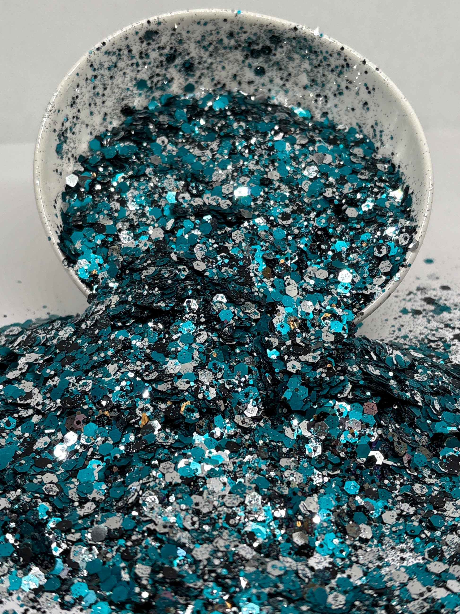 Concho – This striking mix of deep turquoise, bold black, and shimmering silver captures the spirit of a hand-tooled belt buckle gleaming under the rodeo lights. Like the timeless Western conchos that adorn saddles and silverwork, this glitter shines with heritage and strength. The turquoise sparkles with desert-sky brilliance, the black grounds it with rugged grit, and the silver flashes like polished metal. Perfect for projects that call for a touch of Southwestern tradition with a modern shimmer.