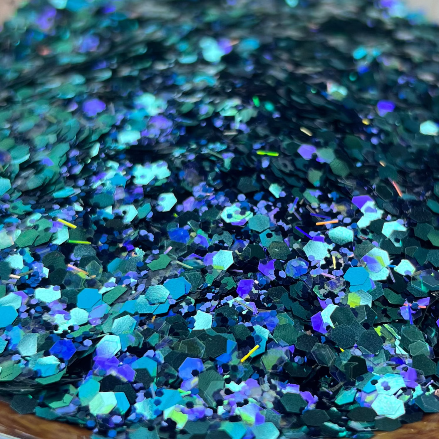 Dive into Deep Waters, a bold, mysterious blend of deep turquoise, midnight blue, silver, and iridescent pops of purple. This oceanic-inspired mix shifts and shimmers like moonlight over still water, giving your projects rich dimension and unforgettable depth.
