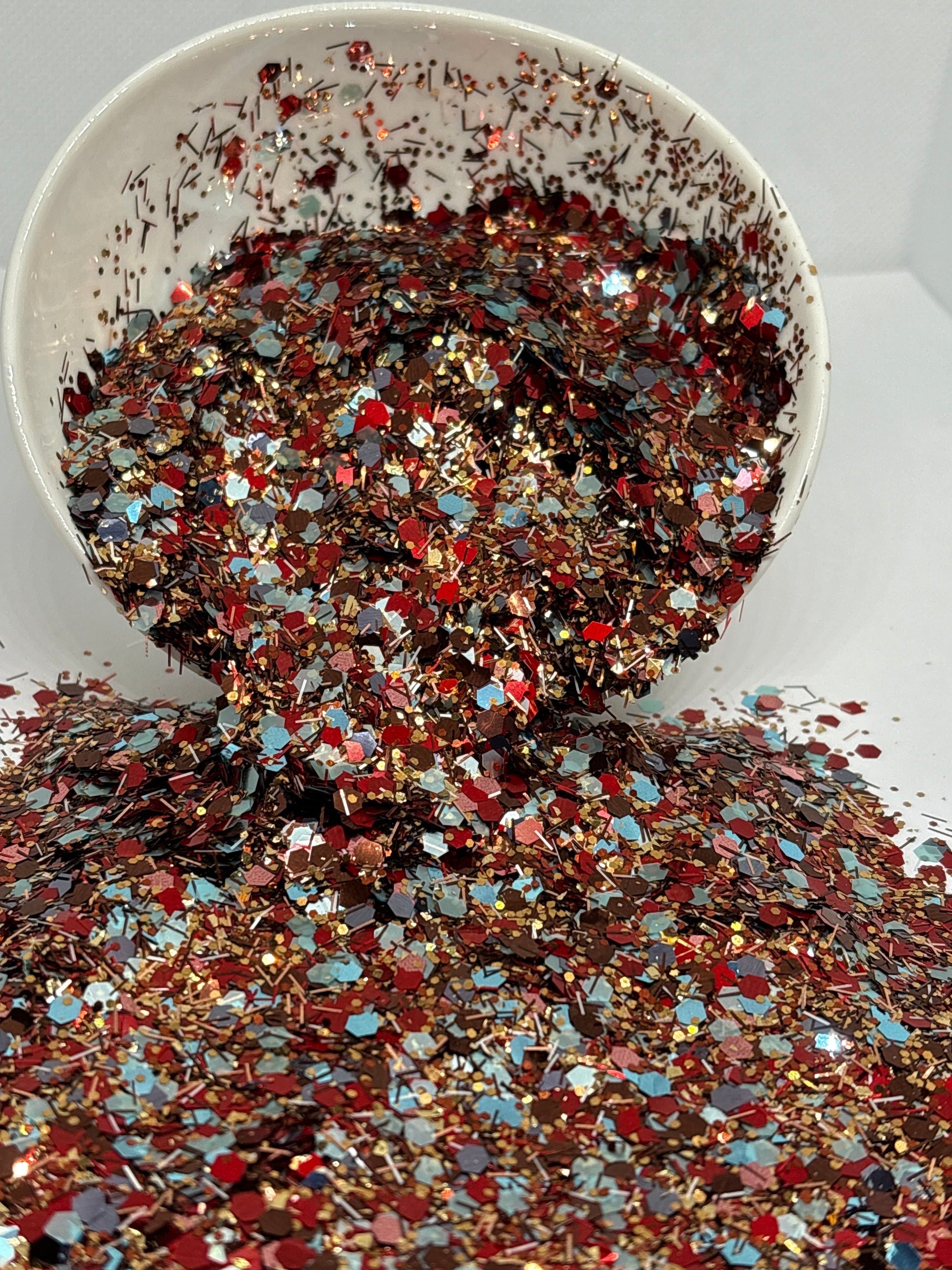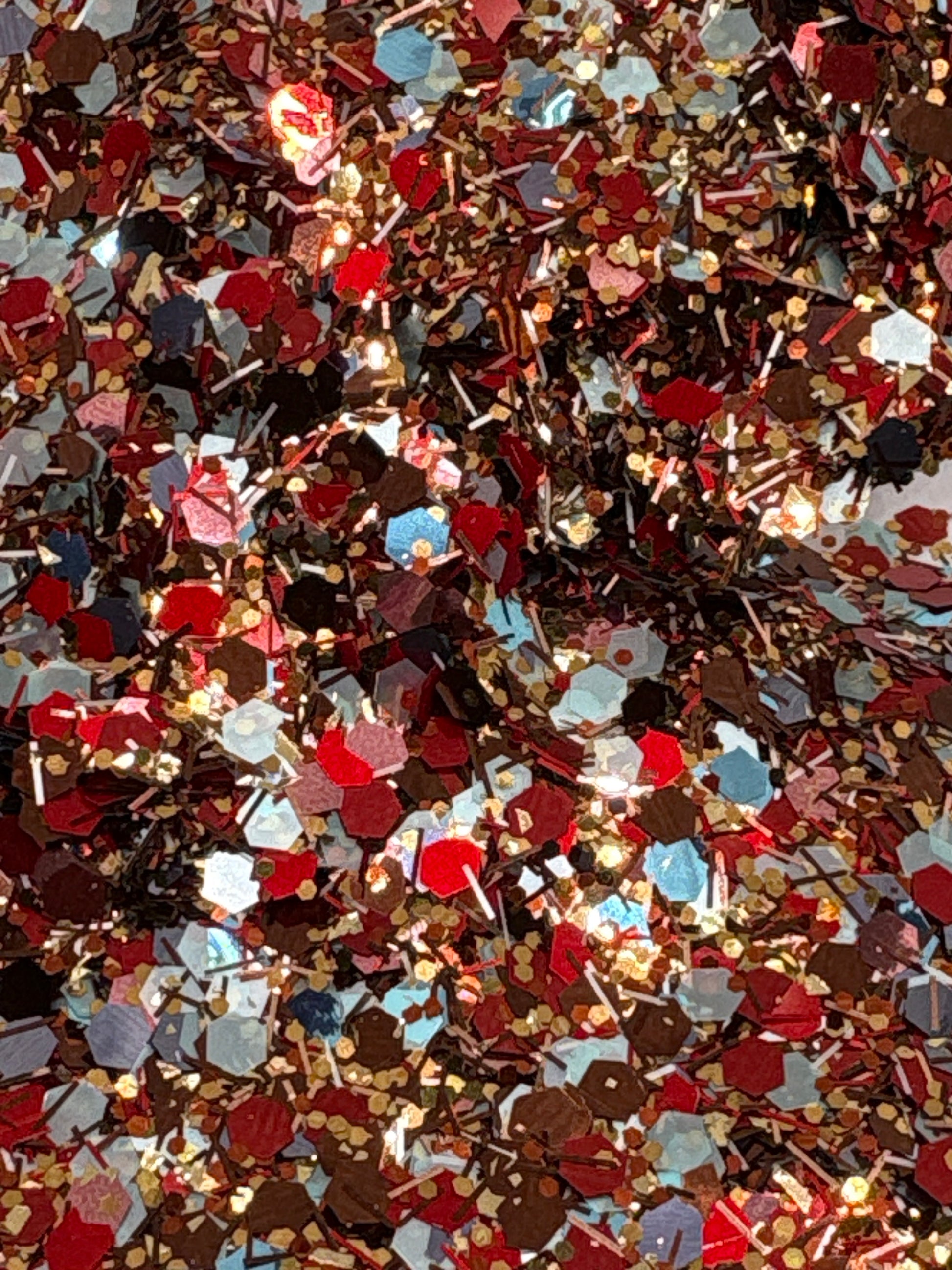 Pop’s Old Ranch Truck – This glitter mix tells the story of worn leather seats, dusty backroads, and a dash of turquoise charm tucked in the glovebox. The deep reds shine like rust kissed by the Texas sun, bronzes and browns echo the weathered steel and cracked earth, while flashes of turquoise glimmer like old patina and ranch jewelry. Rugged, nostalgic, and full of heart, this mix brings back the grit and glory of a truck that’s hauled its weight and then some across generations