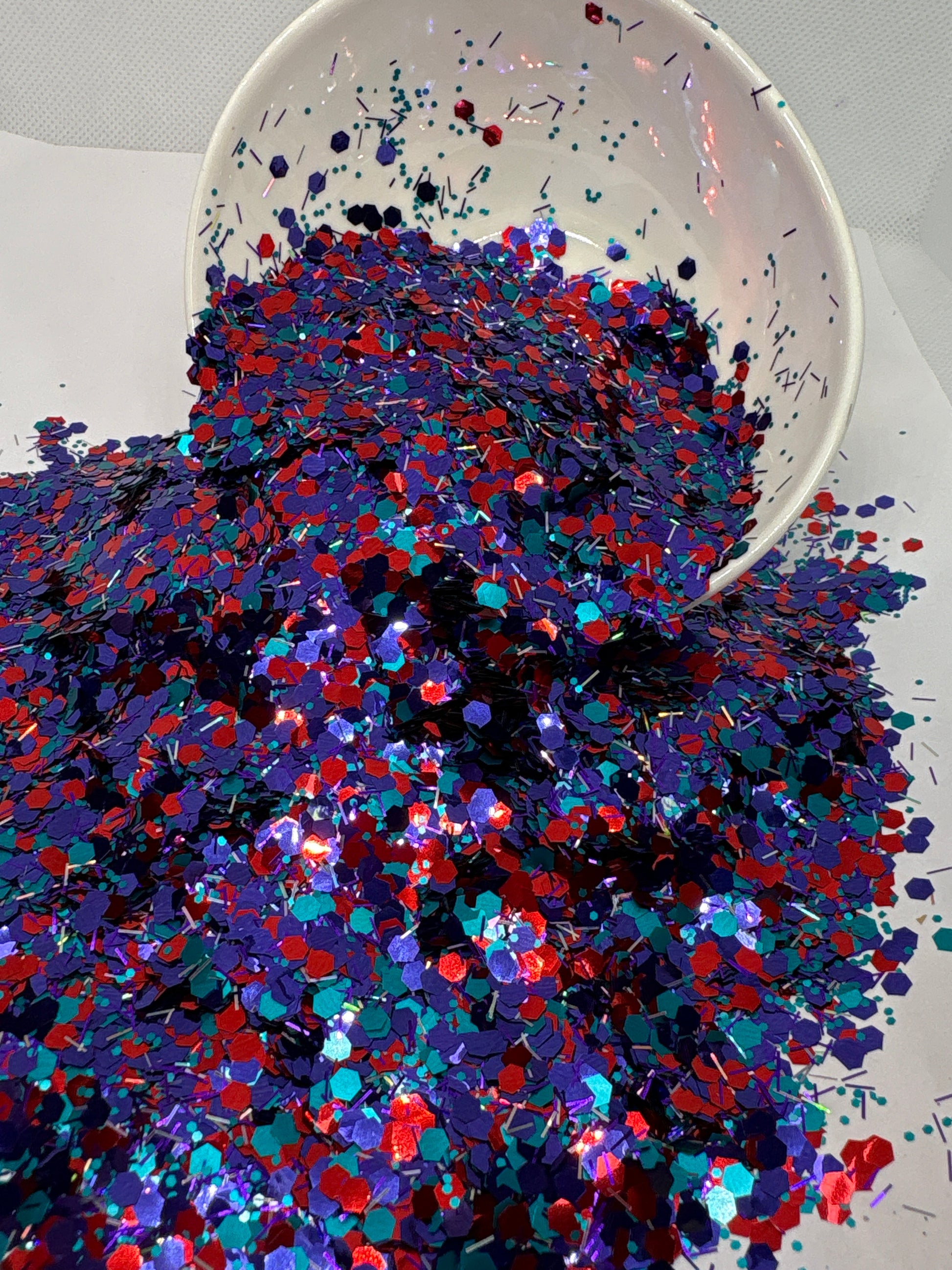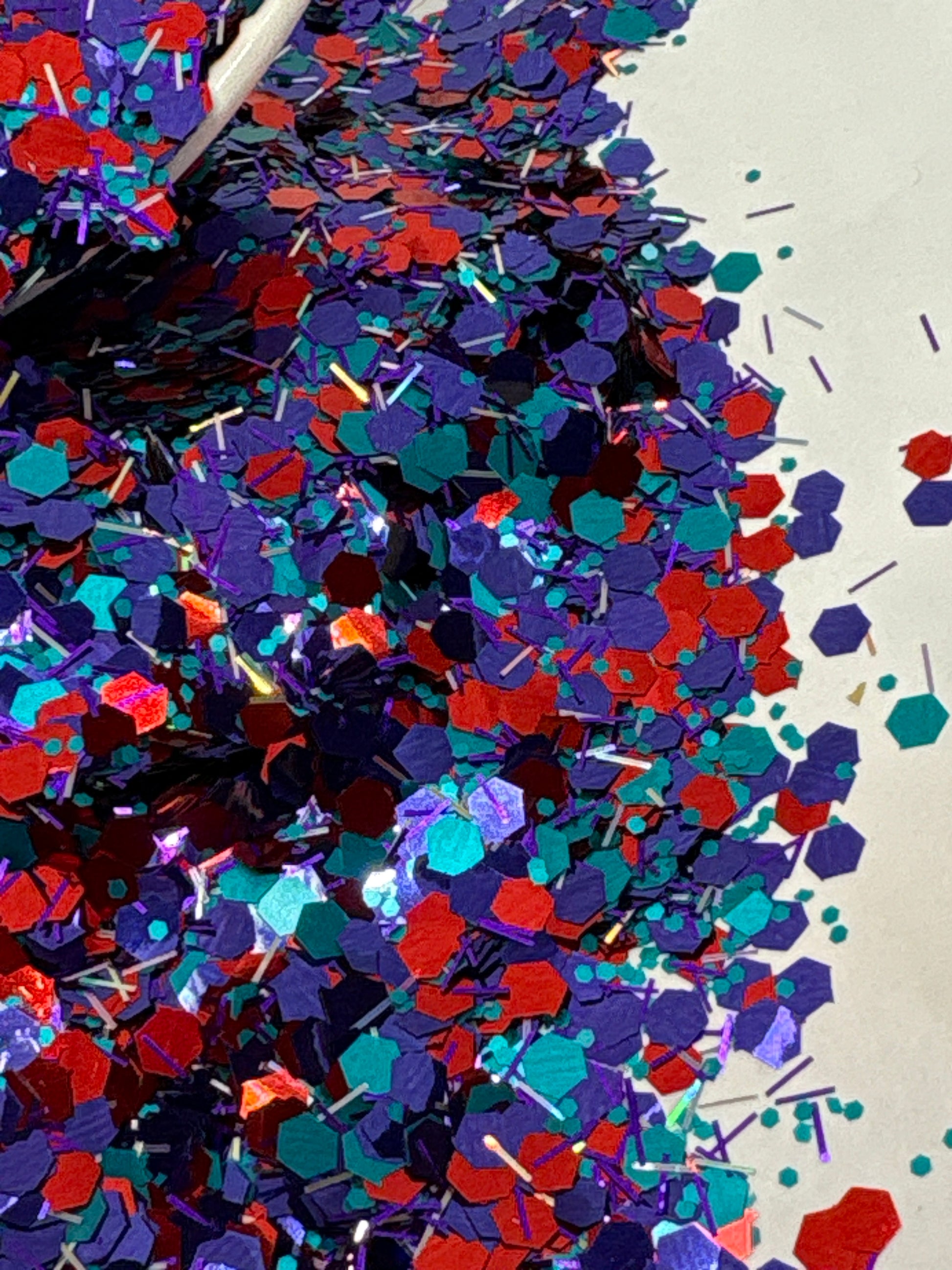 Screaming Peacock is a wild burst of ranch-royalty shimmer, strutting in like the loudest bird at the rodeo. This mix fans out with dazzling turquoise, fiery red, and deep purple—colors that dance together in a proud display. Scattered through are flashes of holographic silver and purple tinsel glitter, catching every sliver of light and throwing it back in a showy, high-shine spectacle. Whether you’re crafting tumblers, resin art, or rodeo-ready décor, this glitter won’t whisper—it’ll holler across the whole arena‘