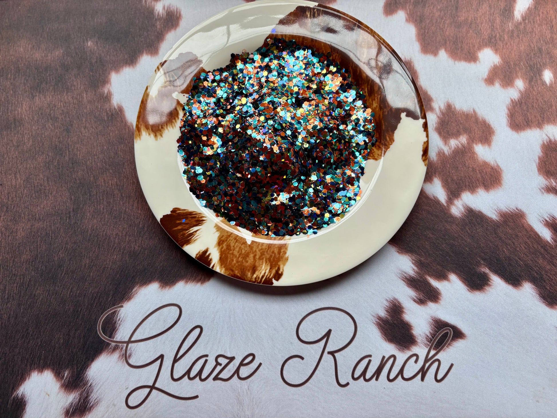 Rich and complex like its namesake, Texas Tea is a bold blend of turquoise, teal, copper, gold, and deep brown. This mix captures the spirit of the Lone Star State—earthy and sun-warmed with a touch of untamed shimmer. Perfect for western-inspired projects or any design that calls for a grounded yet dazzling finish.