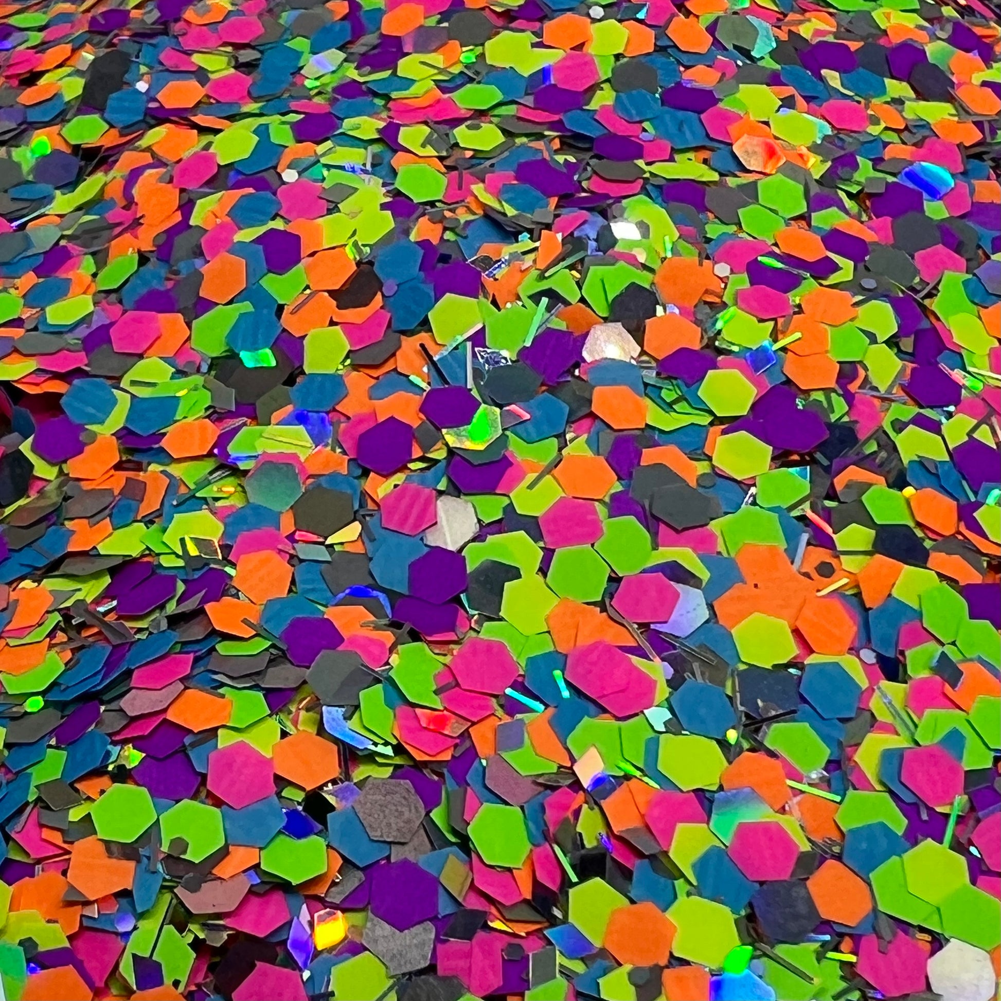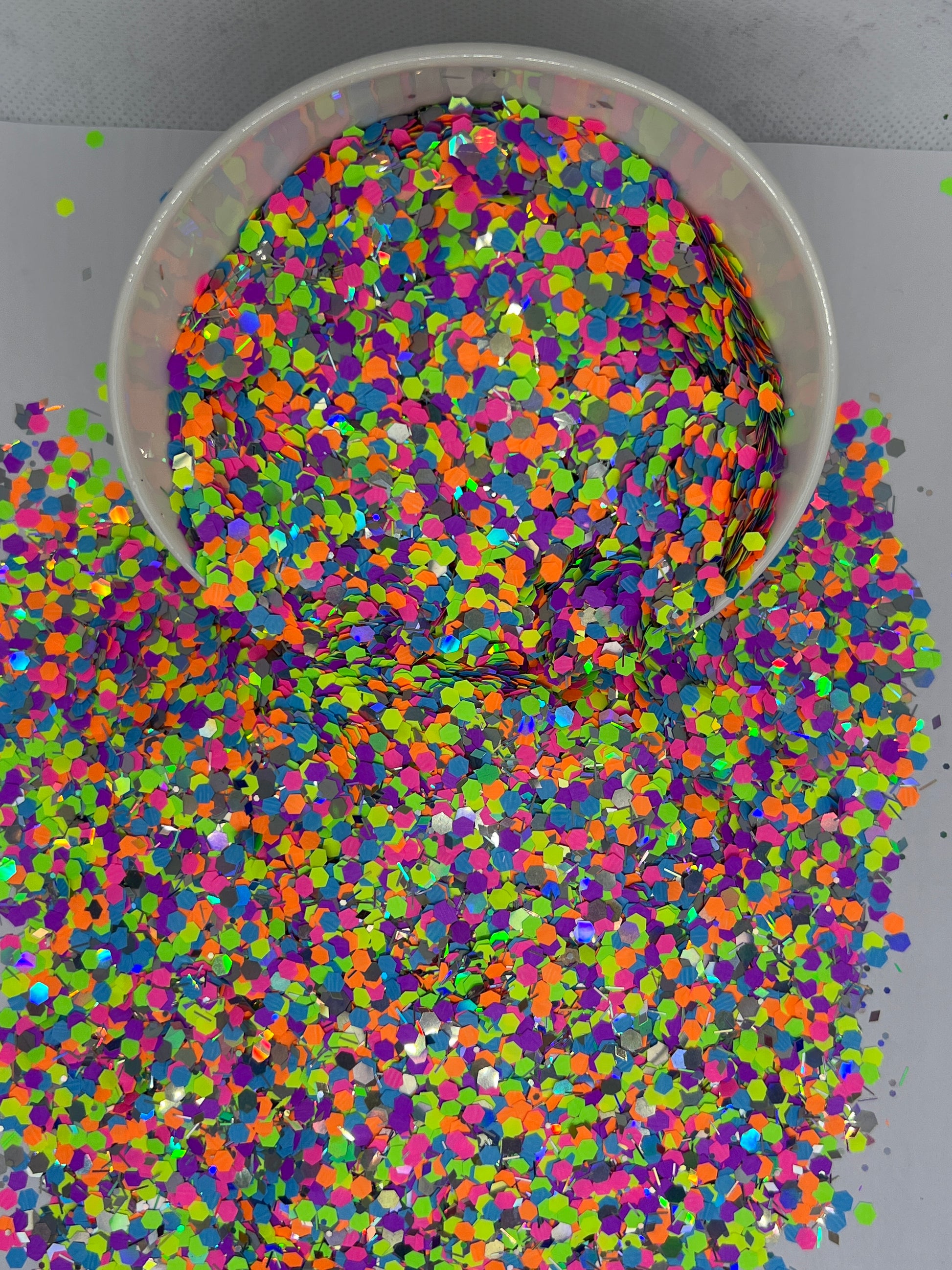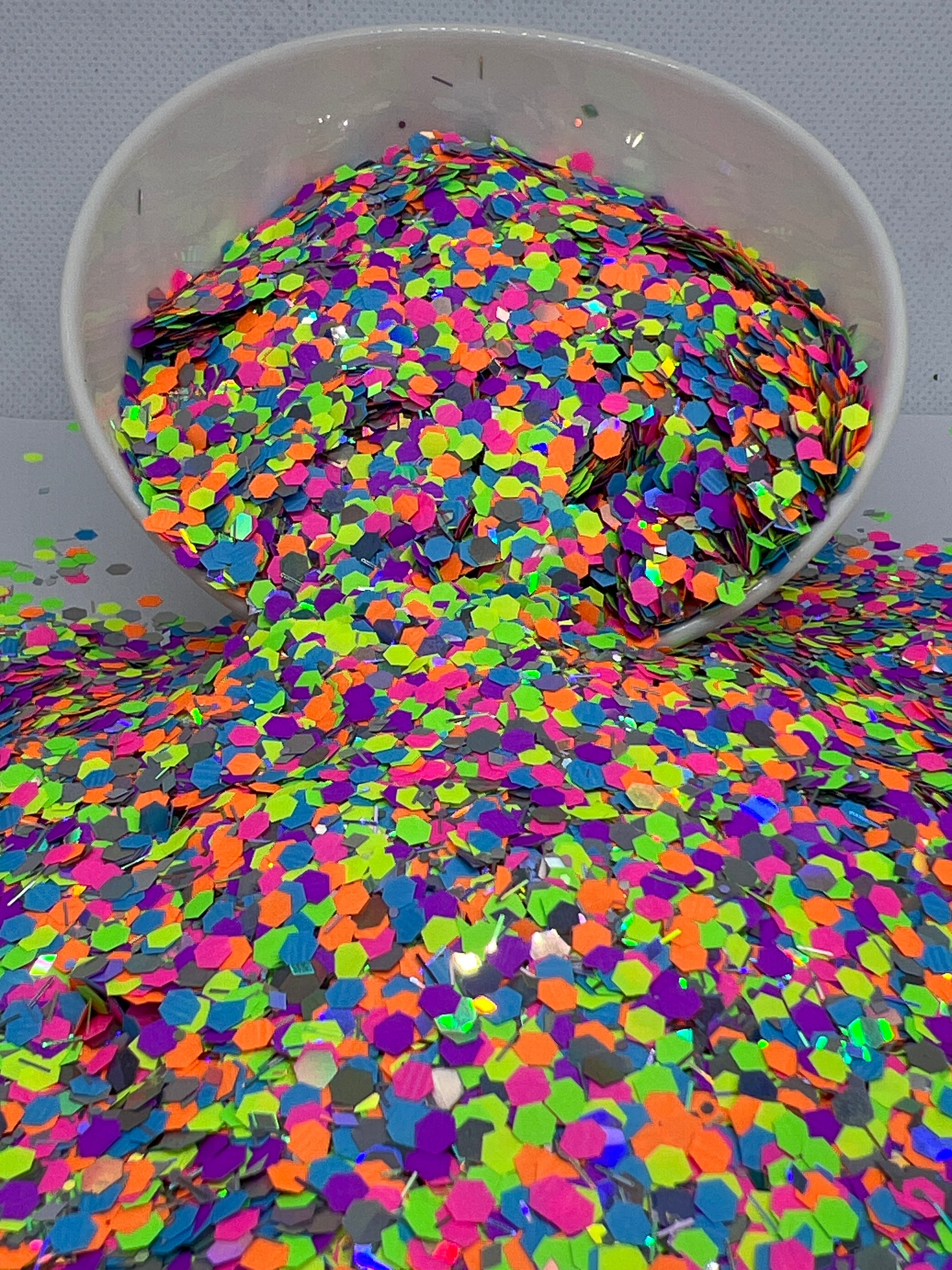 Turn and Burn – A high-energy neon blend bursting with electric pink, green, yellow, orange, and blue, topped with flashes of silver. This mix is perfect for bold designs that demand attention and bring the party to your projects.